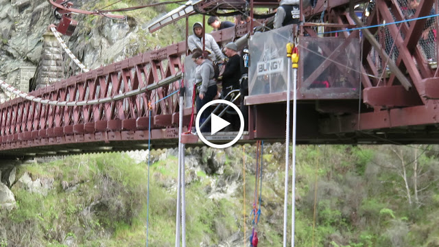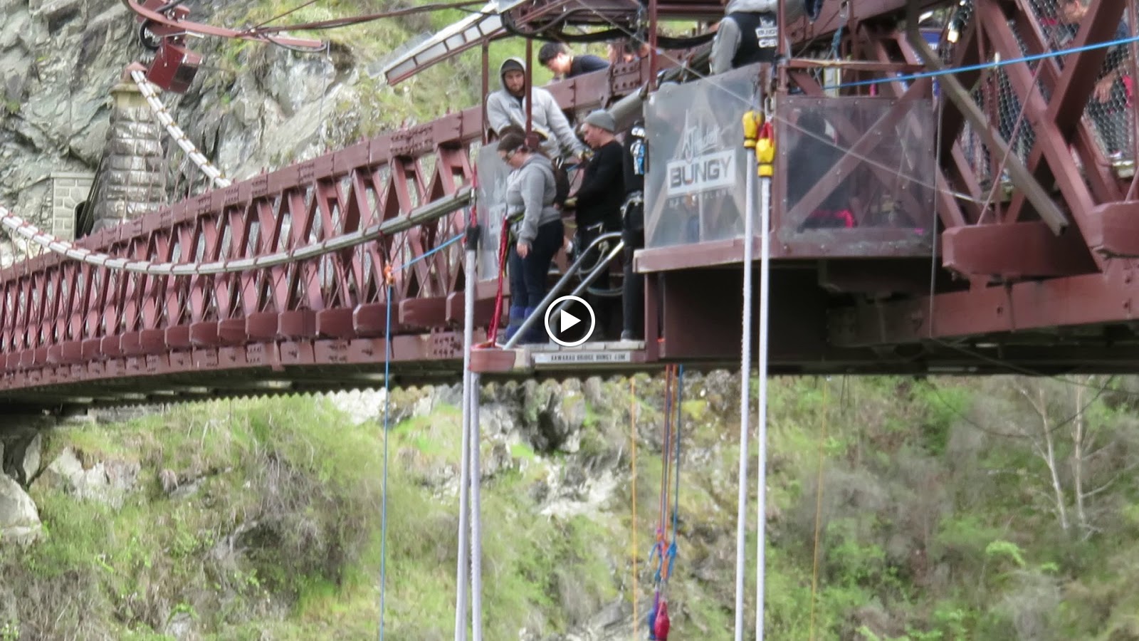 Il n’y a pas long à faire entre Cromwell et Queenstown, notre dernière étape du voyage, mais nous avions deux arrêts très importants à faire. Le premier était AJ Hackett Bungy, pour cinq membres de notre communauté qui s’étaient inscrits au bungee. Seamus l’Irlandais, Carol et Katie les Louisianaises, Rebecca et Anthony les Floridiens, ont tous décidé de sauter un pont haut de 43 mètres. Le Néo-Zélandais AJ Hackett est le premier à avoir commercialisé le bungee, dès 1986.